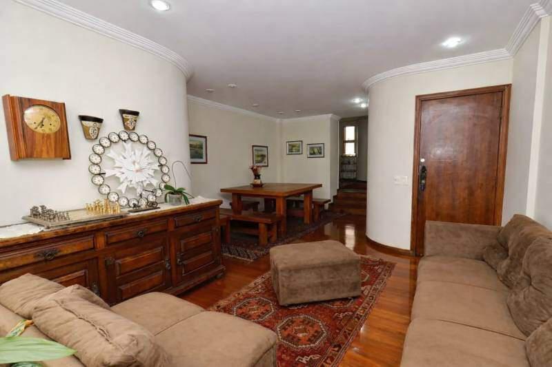 Sala ampla para dois ambientes, com piso em tábua corrida, teto rebaixado e iluminação planejada, sala de TV, 04 quartos amplos, todos com piso em taco de madeira e armários, sendo 1 suíte com bancada em granito, armários, espelho, box em blindex e banheira, cozinha ampla, com piso e bancada em granito e armários planejados, banheiro social com espelho, bancada em granito, armários e box em blindex, dependência de empregada completa, com banheiro, cama boliche duas pessoas e área de serviço com tanque e armários planejados