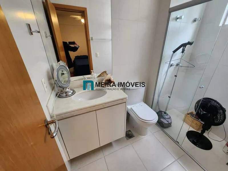 ¿ Banheiro social com bancada em mármore, armário, box blindex, piso em porcelanato