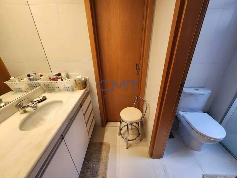 ¿ Banheiro social com bancada em mármore, armário, box blindex, piso em porcelanato.