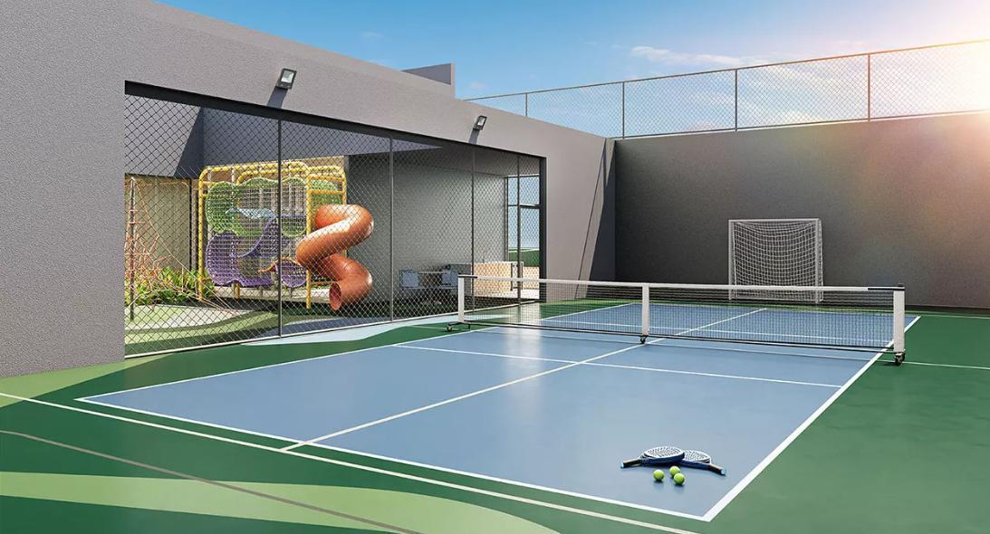 Esportes: quadra de tênis de saibro, quadra multiuso para padel/pickleball/futebol.