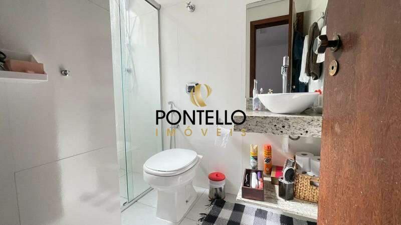 Banheiro social com armários, box em blindex e piso em porcelanato