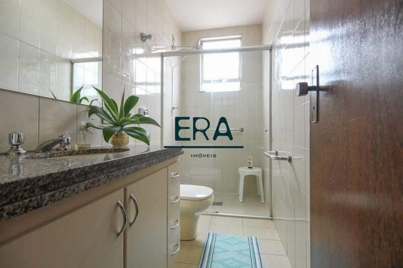 1 banheiro social com armários e box em blindex, piso em cerâmica.