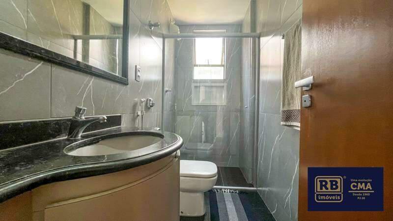 Banheiros (social e suíte) com fino acabamento, armários, espelho e box em blindex.