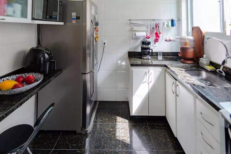 Cozinha ampla e montada, com armários planejados e bancadas em granito, permanecendo fogão e exaustor.