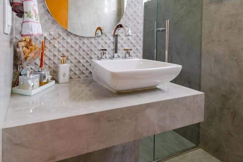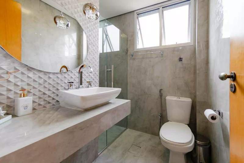 Banhos (social e suíte) com bancadas em granito, armários, box em blindex e espelhos.