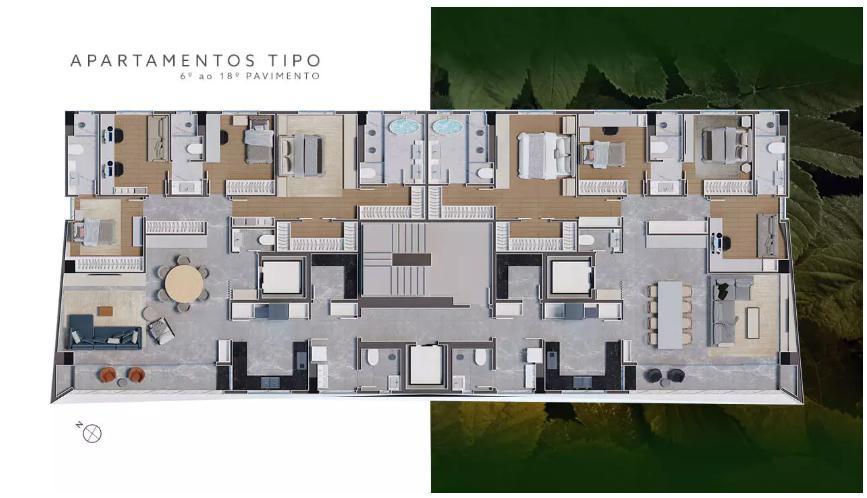 Configuração: 4 quartos: 2 suítes (sendo uma suíte máster com 2 closets); 2 semi-suítes; Sala ampla para 2 ambientes com integração à varanda; Varanda gourmet panorâmica com previsão para churrasqueira; Lavabo elegante e bem localizado; Cozinha espaçosa com área de serviço independente; Banheiro de serviço + DCE (dependência completa de empregada)