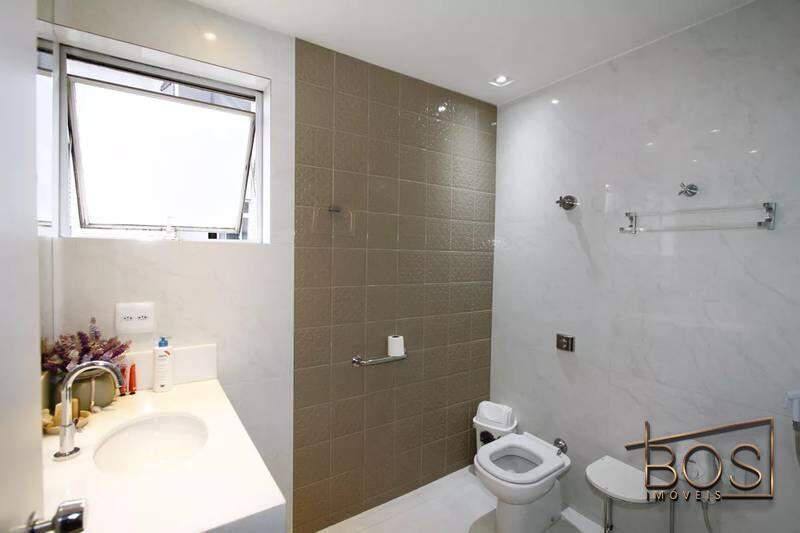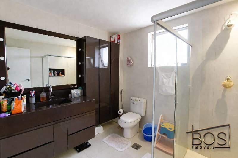 - Banheiro social com bancada em granito, espelho, armários e box em blindex