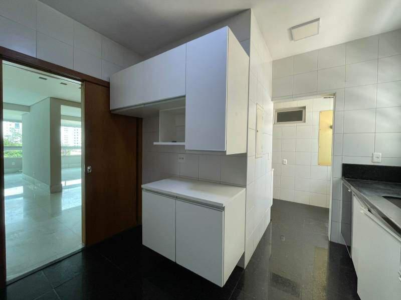 Cozinha ampla e funcional, com piso em granito preto polido, armários planejados em acabamento branco e bancada em granito
