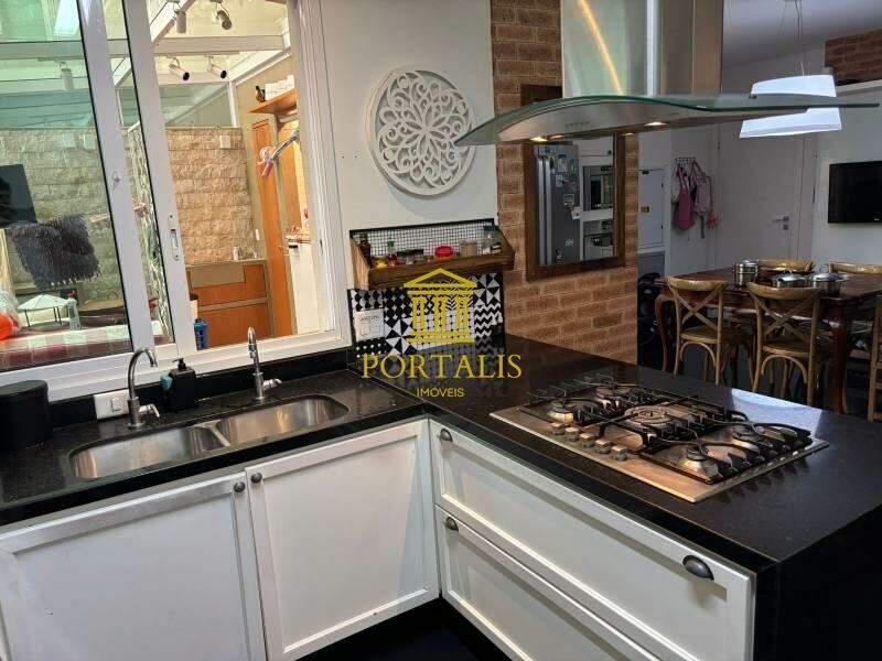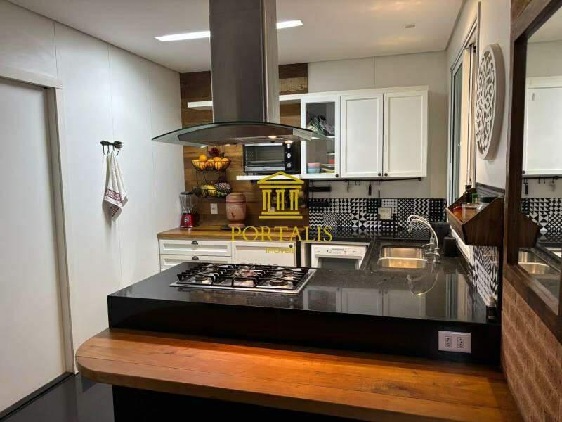 Cozinha ampla com piso e bancada em granito, armários planejados e coifa