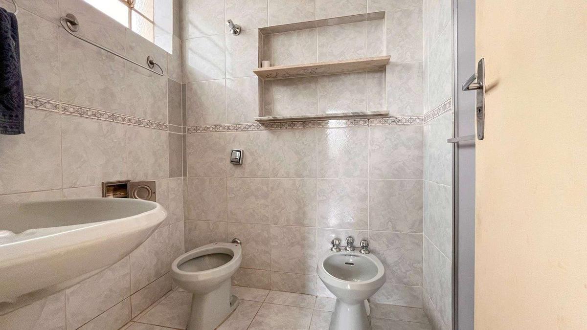 ? Banheiro social com acabamento em cerâmica, bancadas em granito, armários sob as pias.