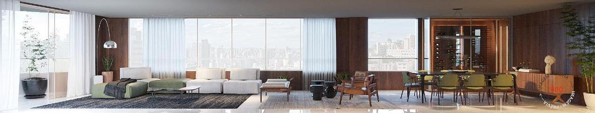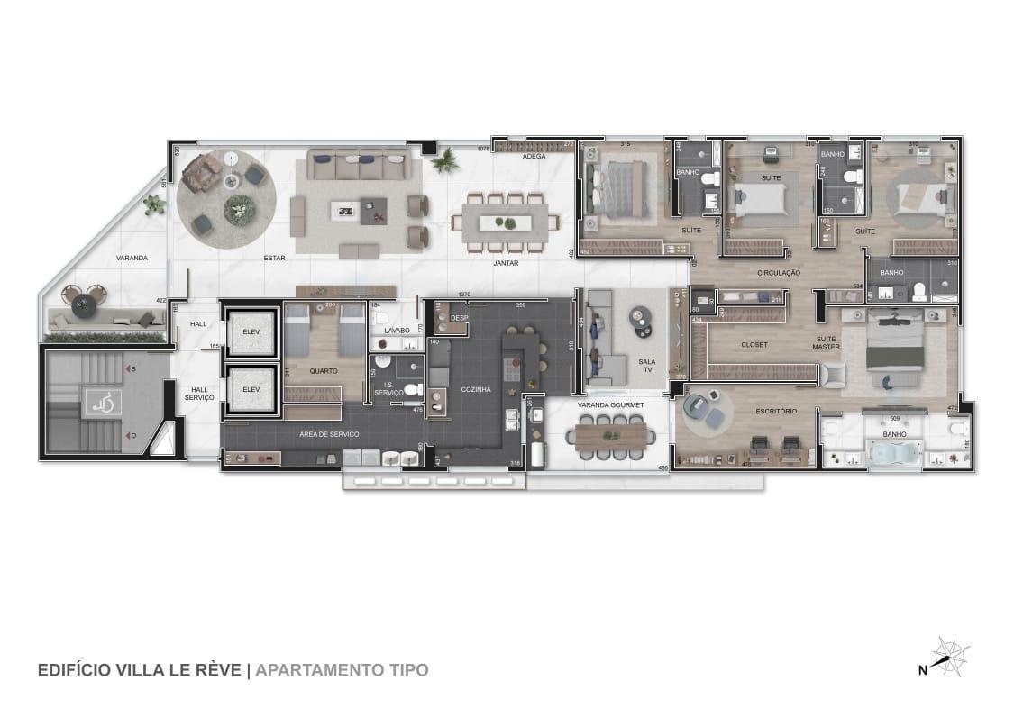20 apartamentos (01 por andar), 02 elevadores, Apartamentos com 315m², 04 suites, sala 03 ambientes, varanda social, varanda gourmet, lavabo, estar íntimo, escritório, cozinha, área, quarto de serviço e banho de serviço, 05 Vagas de Garagem, com àrea total de 365m²