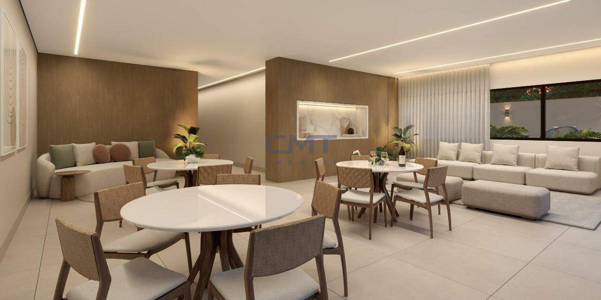 Sala para dois ambientes com piso em porcelanato, janelas amplas proporcionando melhor ventilação e luminosidade natural no interior do ambiente. Ambiente conta também com lavabo com piso e bancada em granito, pia com cuba sobreposta.