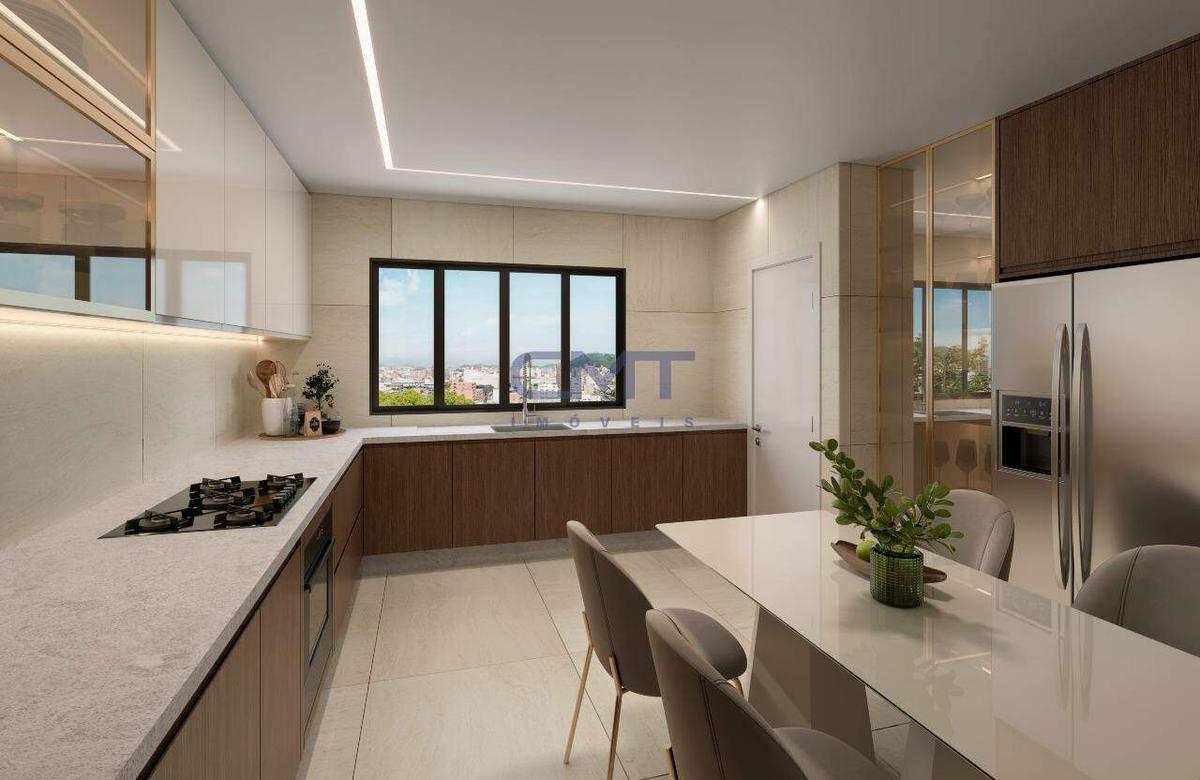 4 banhos, sendo 2 suítes, 2 semissuítes e 1 lavabo. Acabamentos de alto padrão, bancadas em granito e ventilação natural.