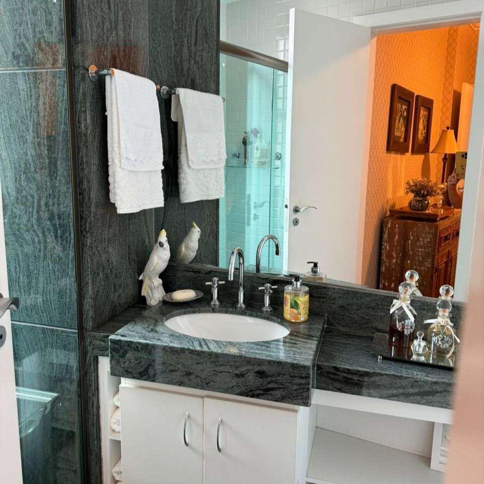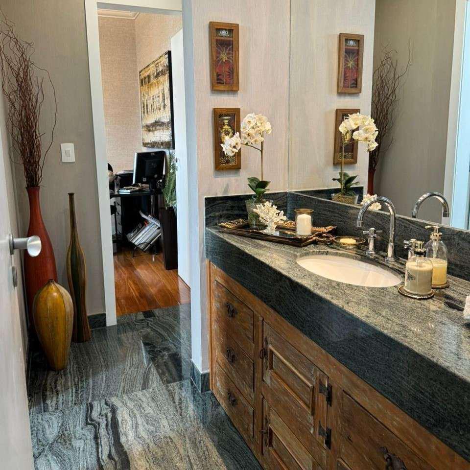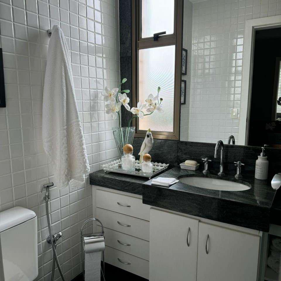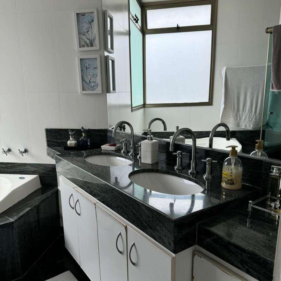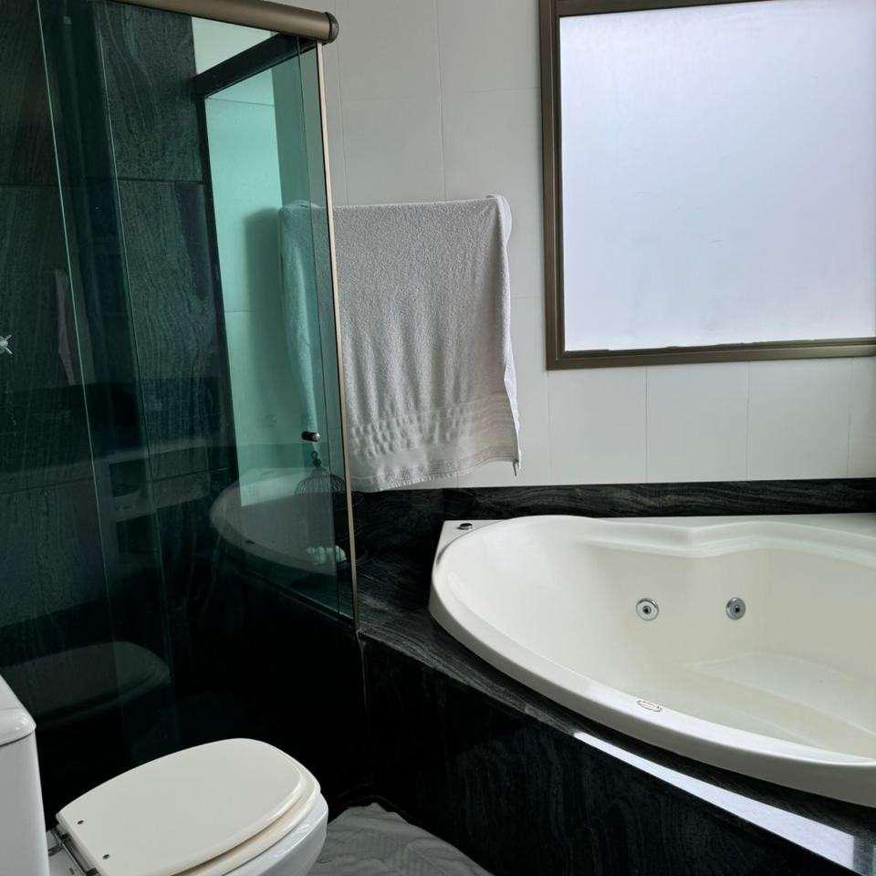Quatro quartos bem distribuídos, sendo duas suítes e duas semi-suítes, todos equipados com armários planejados. A suíte máster conta com hidromassagem, closet e acabamentos de alto padrão. Banheiros com box em vidro temperado, armários e espelhos de qualidade.
