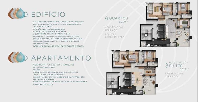 Os apartamentos do 6º ao 18º andar possuem 2 unidades por andar, com metragens que variam de 139m² a 151m². Já do 19º ao 23º andar, há apenas uma unidade por andar, garantindo ainda mais exclusividade. Cada apartamento possui 4 quartos, sendo 2 suítes e 2 semi-suítes, lavabo, sala para 02 ambientes, varanda, cozinha, área de serviços independente com banho de empregada e 3 vagas de garagem.