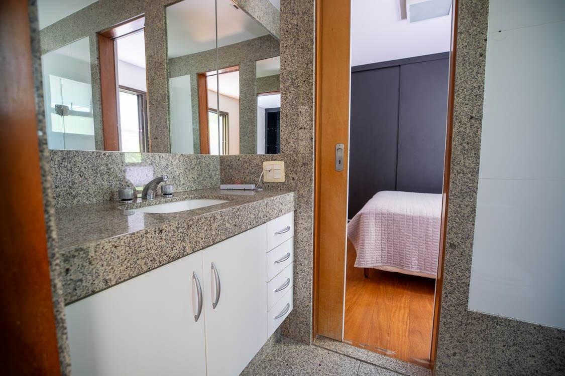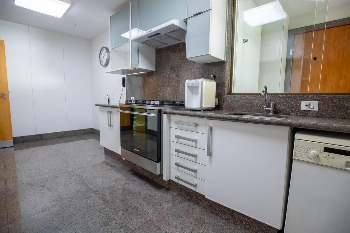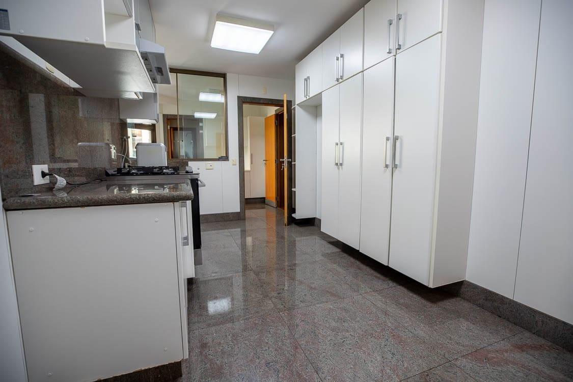 APARTAMENTO: Apartamento com 186,08 m² de área interna, claro e arejado, salão para três ambientes amplos, varandão, lavabo, com piso em mármore, são 04 quartos, sendo 02 semi suítes com armários, uma suíte máster com amplo banheiro com armários, banheira de hidromassagem, armário e closet, todos os banhos com armários, box, espelhos, pisos e bancadas em granito, rouparia no corredor, copa cozinha com armários, fogão, coifa, área de serviço com armários e bancada para passar roupa com pisos frios em granito, dependência completa para empregada, aquecimento solar.