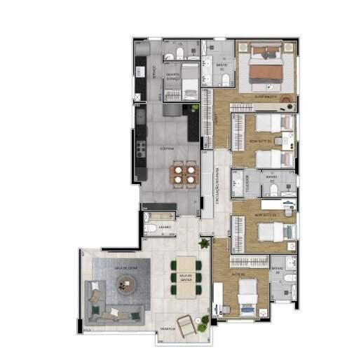 Sala ampla para 02 ambientes, lavabo, 04 quartos confortáveis sendo 02 suites e 02 semi suites, rouparia, cozinha espaçosa e planejada, área de lavanderia, quarto e banheiro de serviço