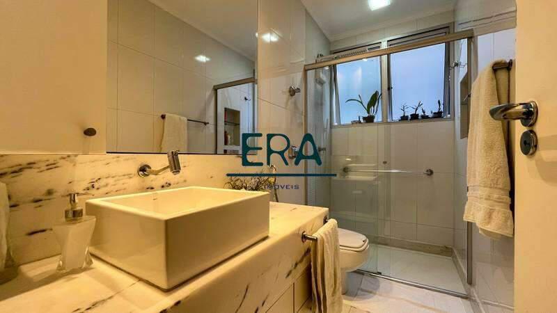 Banheiro social com piso em porcelanato, espelho, bancada em granito, pia em cuba, armários planejados e box em blindex