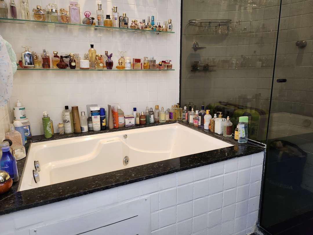 Banheiro Social: Equipado com box em Blindex, armário planejado, espelho e acabamento em cerâmica.