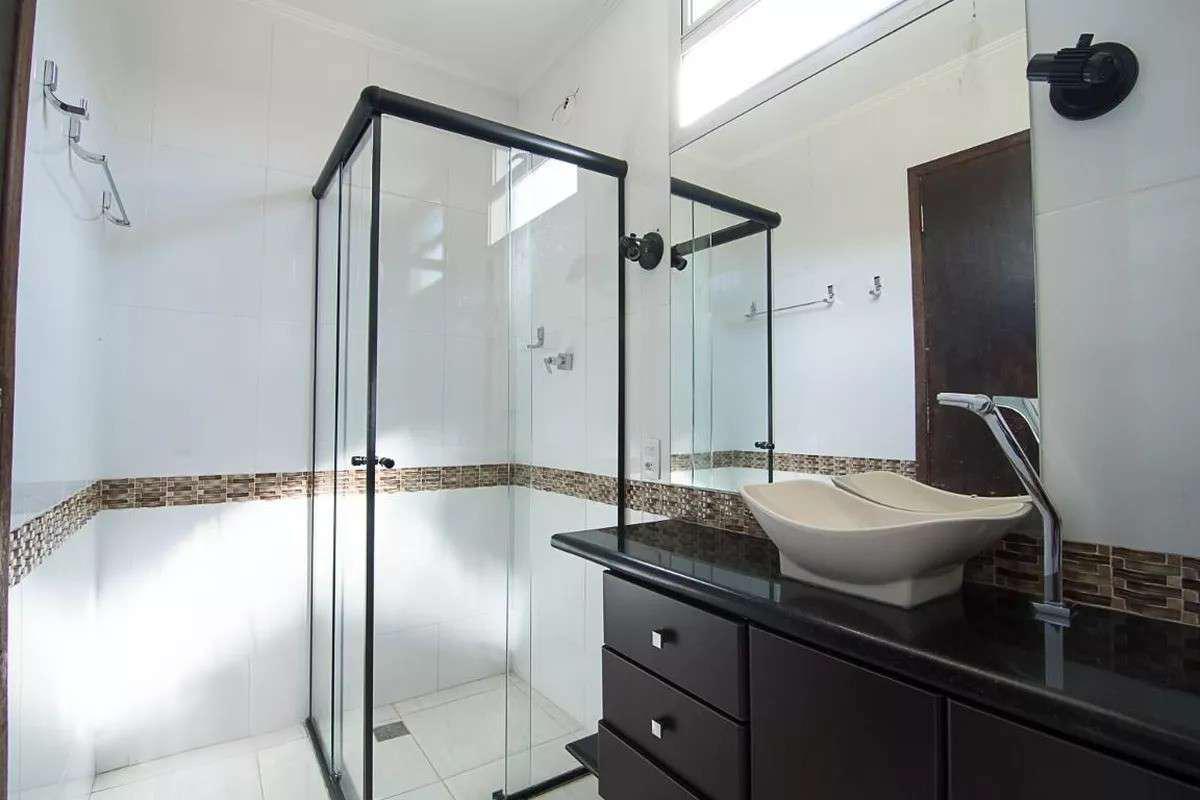 Banheiros (social e suíte) com revestimento em cerâmica, bancada em granito, armários e box em blindex.