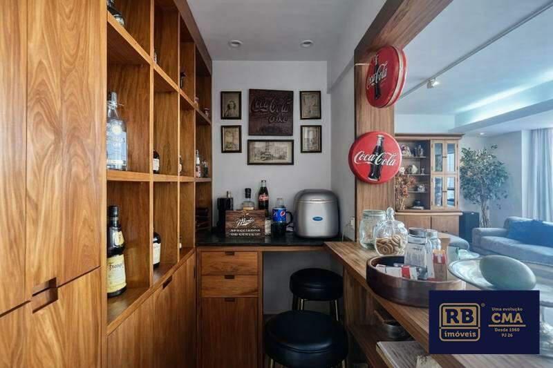 Sala confortável para 3 ambientes com piso em porcelanato, teto rebaixado com projeto luminotécnico, bar montado e varanda integrada à sala.