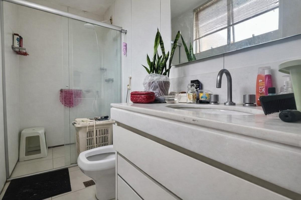 Banheiros (social e suíte) com ótimo acabamento, armários, espelhos e box em blindex.