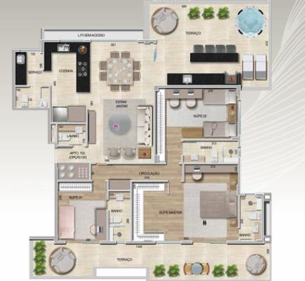 04 quartos sendo 01 suíte master com closet, 03 suítes; Cozinha integrada á sala; lavabo; área de serviço; 02 terraços cobertos.