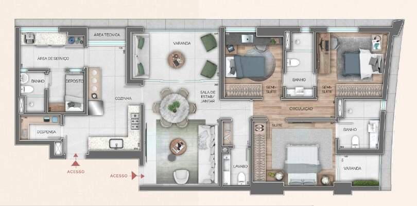 Sala ampla para 02 ambientes, varanda, lavabo, 04 quartos espaçosos sendo 01 suíte Jr 01 suíte máster com closet e varanda e 02 semi suítes, rouparia no corredor, cozinha planejada, despensa, área de lavanderia independente, quarto e banheiro de serviço.