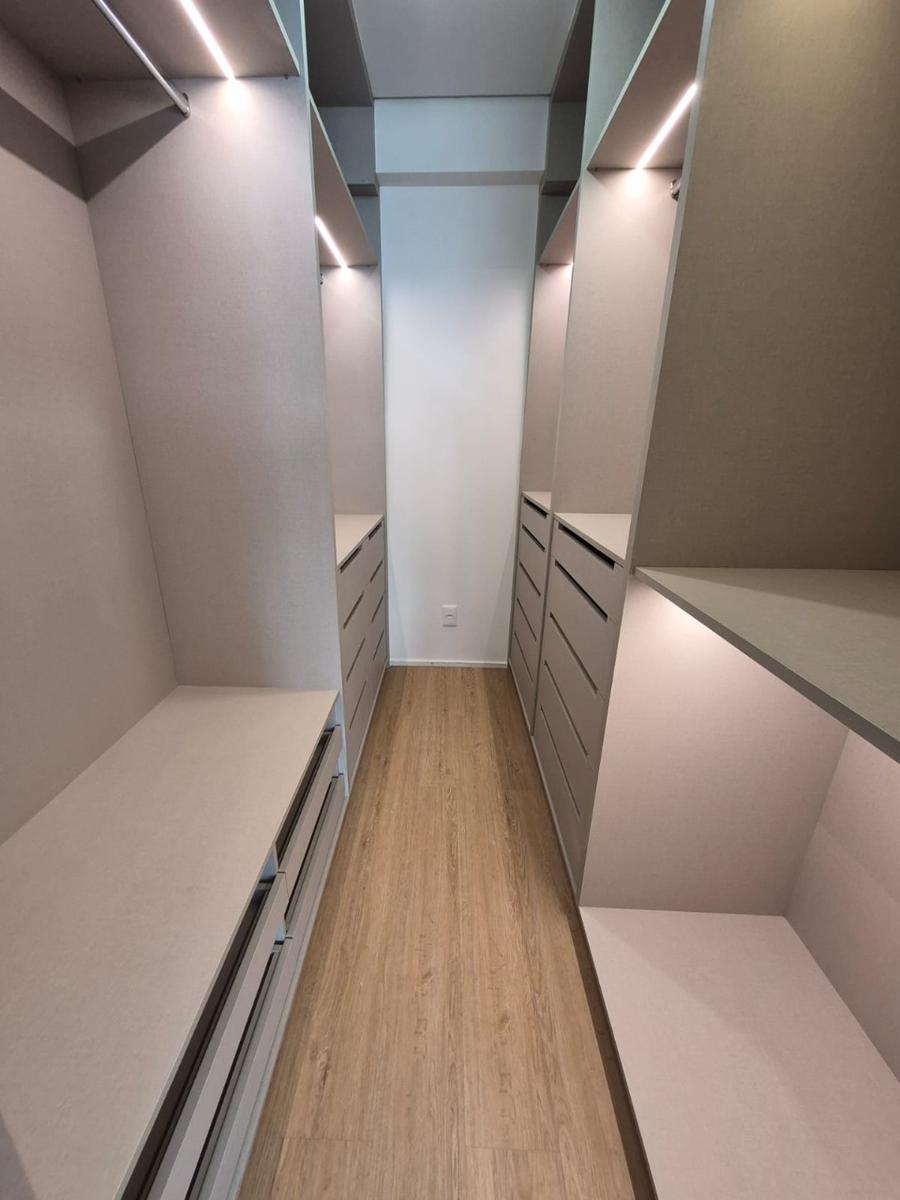 Armários planejados nos quartos e banheiros, inclusive closet na suíte máster. Armários com iluminação.