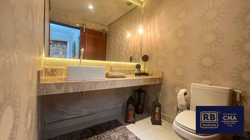 Lavabo decorado, com iluminação planejada, espelho e pia em cuba