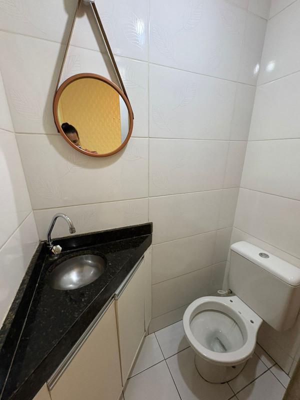 O banho social é completo, com box em blindex e armário planejado.