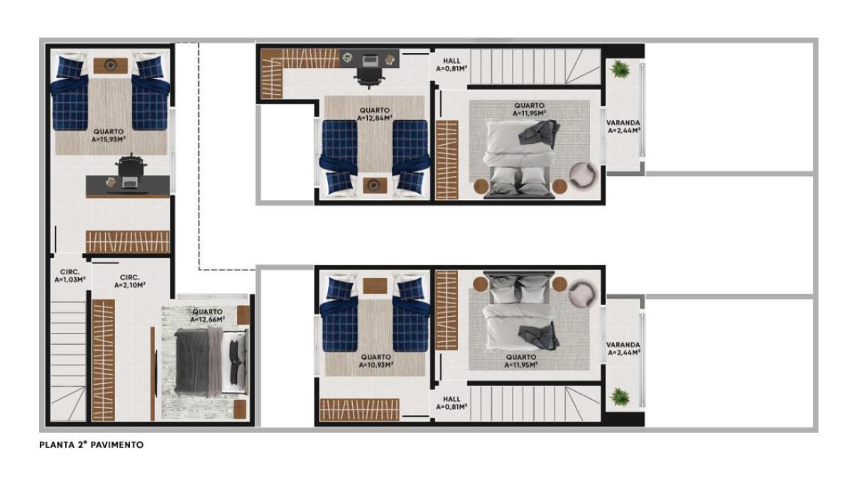 2º Pavimento: 2 quartos, Acabamento a serem definidos decorrer da obra, casa coberta com telhado embutido.