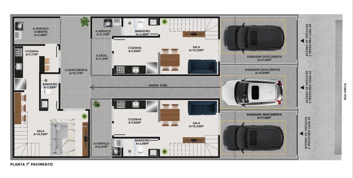 1º Pavimento: sala, banho social, cozinha americana, área de serviço na área privativa com 8m², 01 vaga de garagem, água e luz individual.