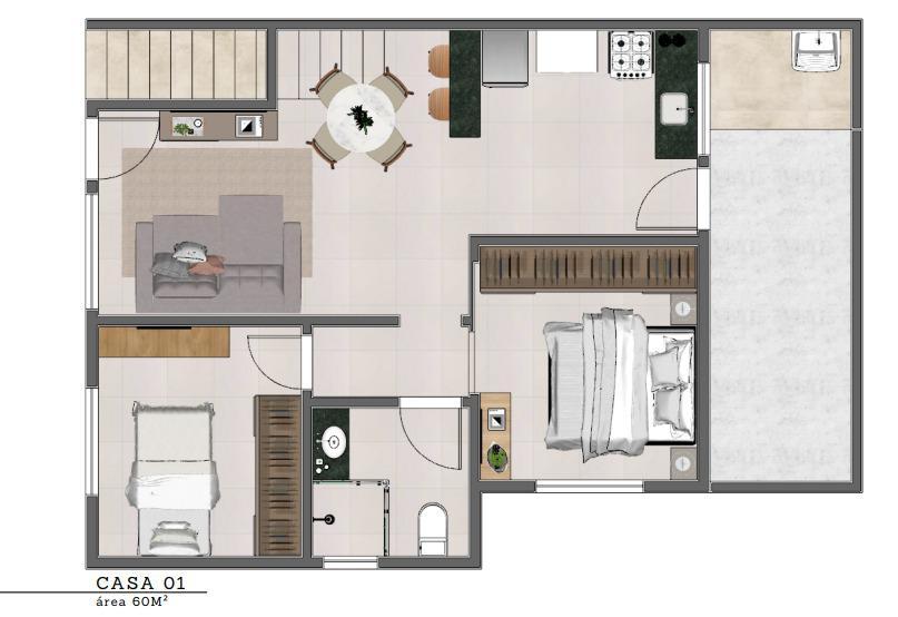 Casa com dois 2 quartos.. 1 banheiro social. cozinha americana. 2 áreas privativas. 1 vaga de garagem