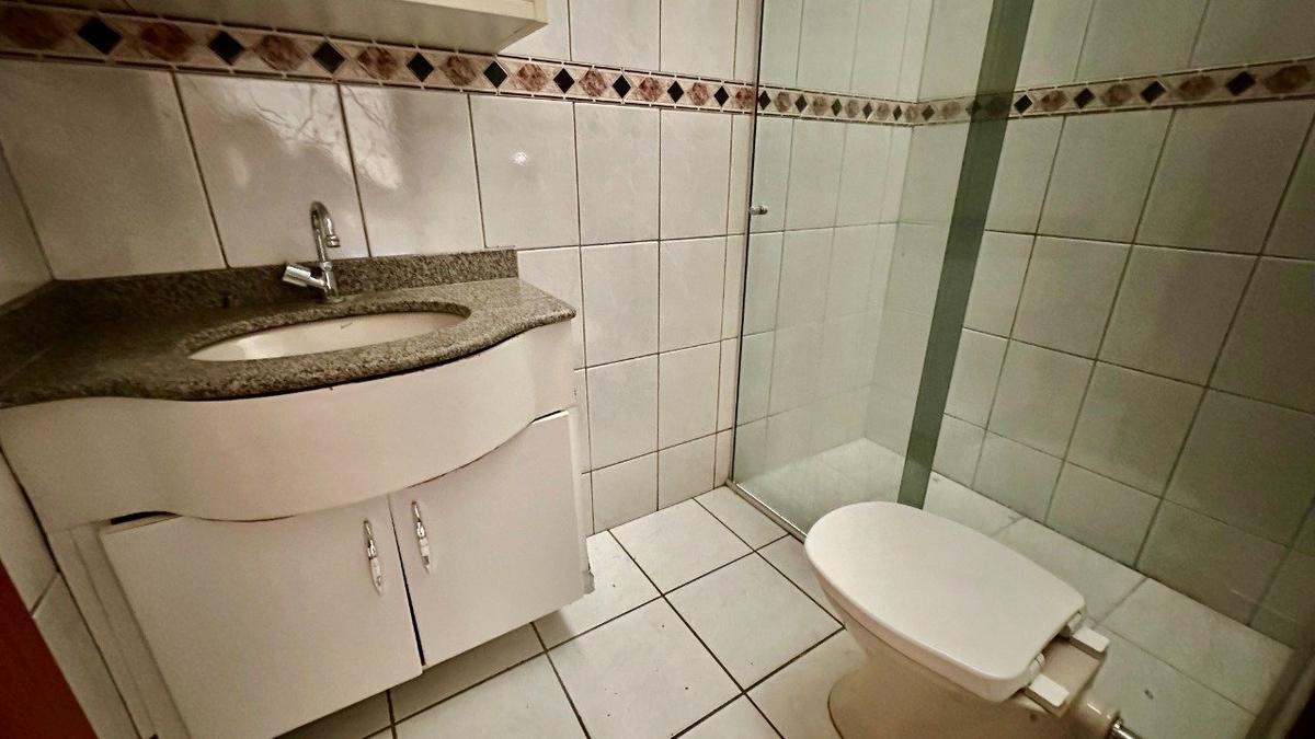 -Banheiro social com acabamento refinado, bancada em granito, armário e box em vidro temperado;