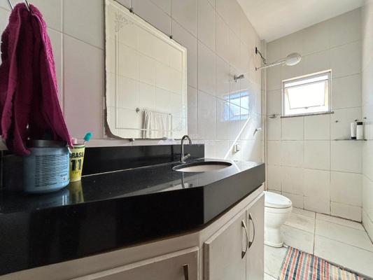-Banheiro social com bancada em granito, cuba embutida e armário planejado