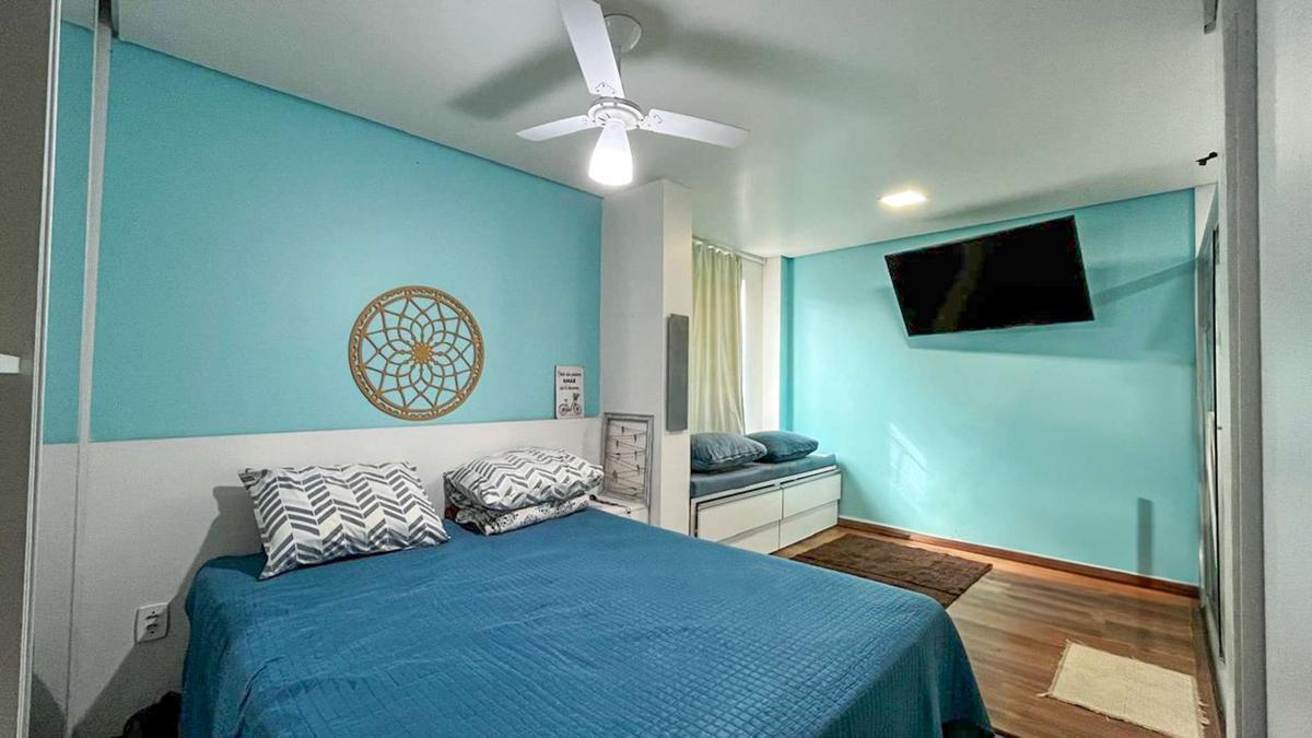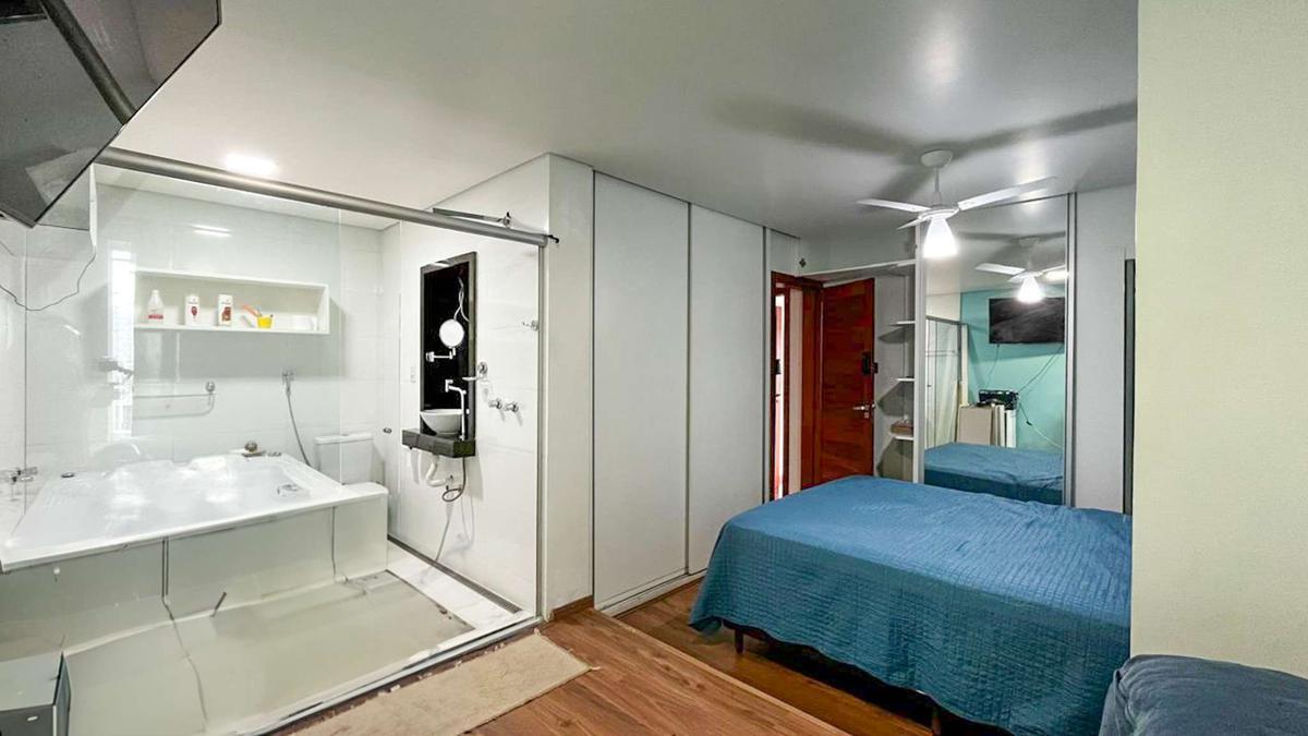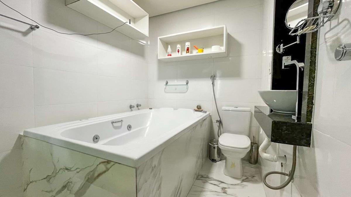 Duas suítes amplas com armários planejados e piso em laminado de madeira, ambas com hidromassagem.