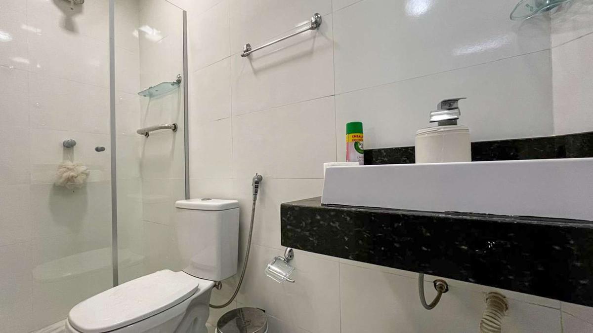Banheiro social com acabamento em porcelanato e box em blindex.