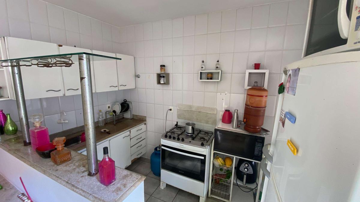 Cozinha equipada com armários modulados, bancada em granito e piso em cerâmica, oferecendo funcionalidade e durabilidade.