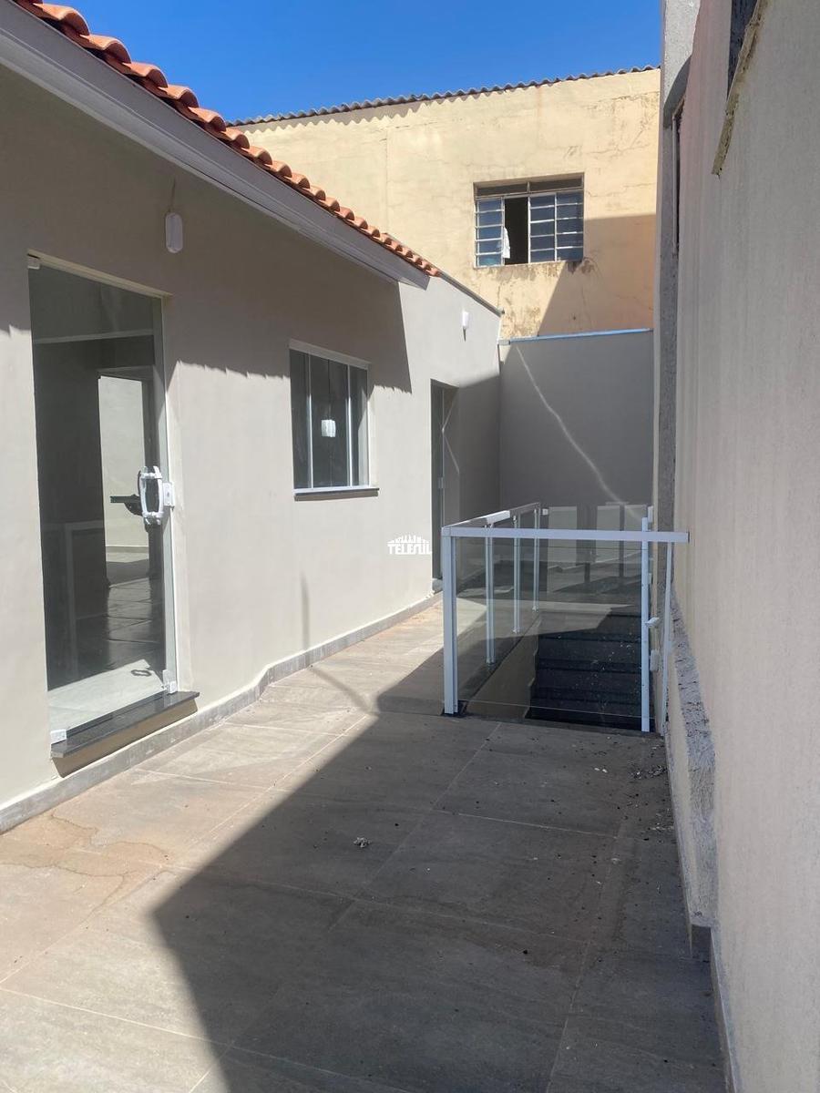 Casa com dois quartos sendo uma suíte com closet, banheiro com box de vidro, e pia de mármore. Quarto e banheiro social também com box e pia de mármore. Sala de estar, cozinha grande com pia de granito preta, lavanderia e quintal, varanda, com espaço para fazer área gourmet, garagem coberta para um carro, parte debaixo com salão amplo para escritório ou depósito.