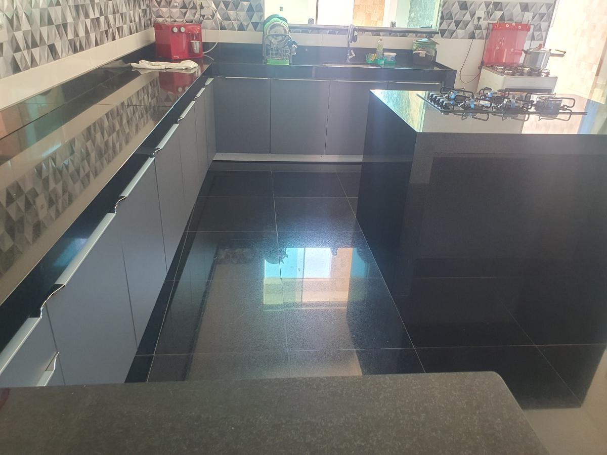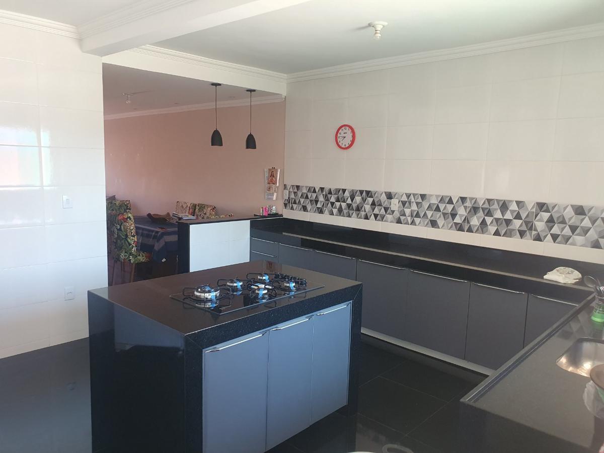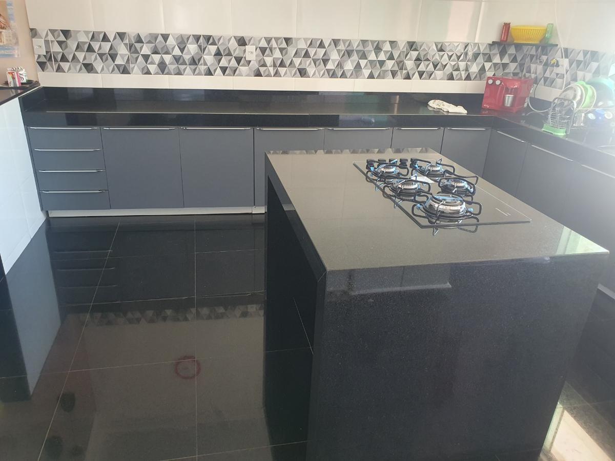 Sala ampla para dois ambientes, piso laminado de madeira, cozinha estilo americana com bancada em granito e armários planejados, piso porcelanato e revestimento em cerâmica, ilha com armários planejados, fogão cook top novo, com 5 bocas, área de serviço coberta e Quintal Amplo com piso em cerâmica, Banheiro com Bancada em Granito e 2 vagas cobertas.