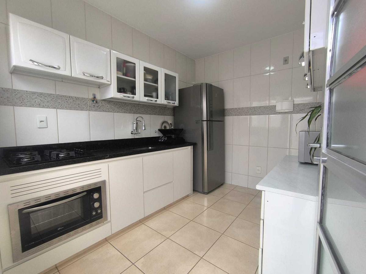 Cozinha planejada, funcional e bem aproveitada, com piso em cerâmica e bancadas em granito;