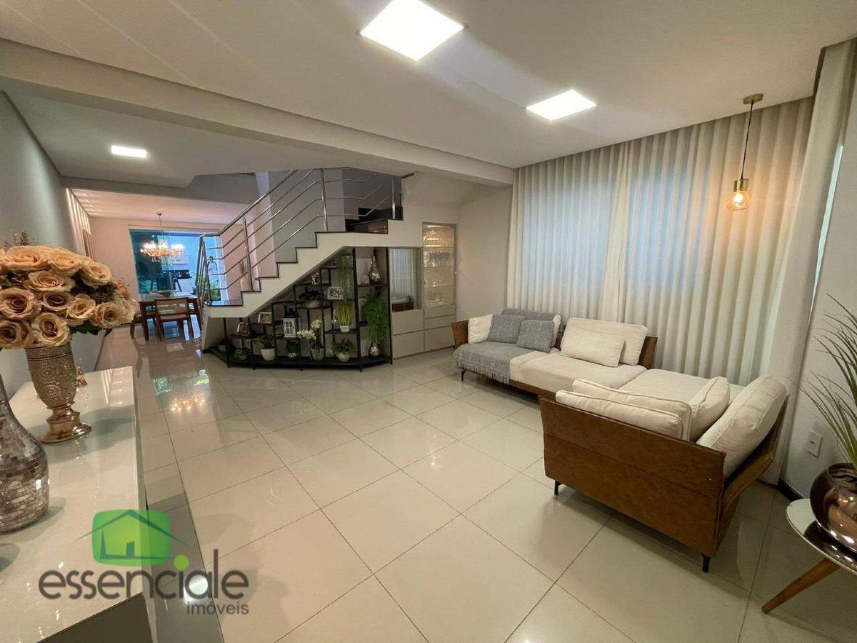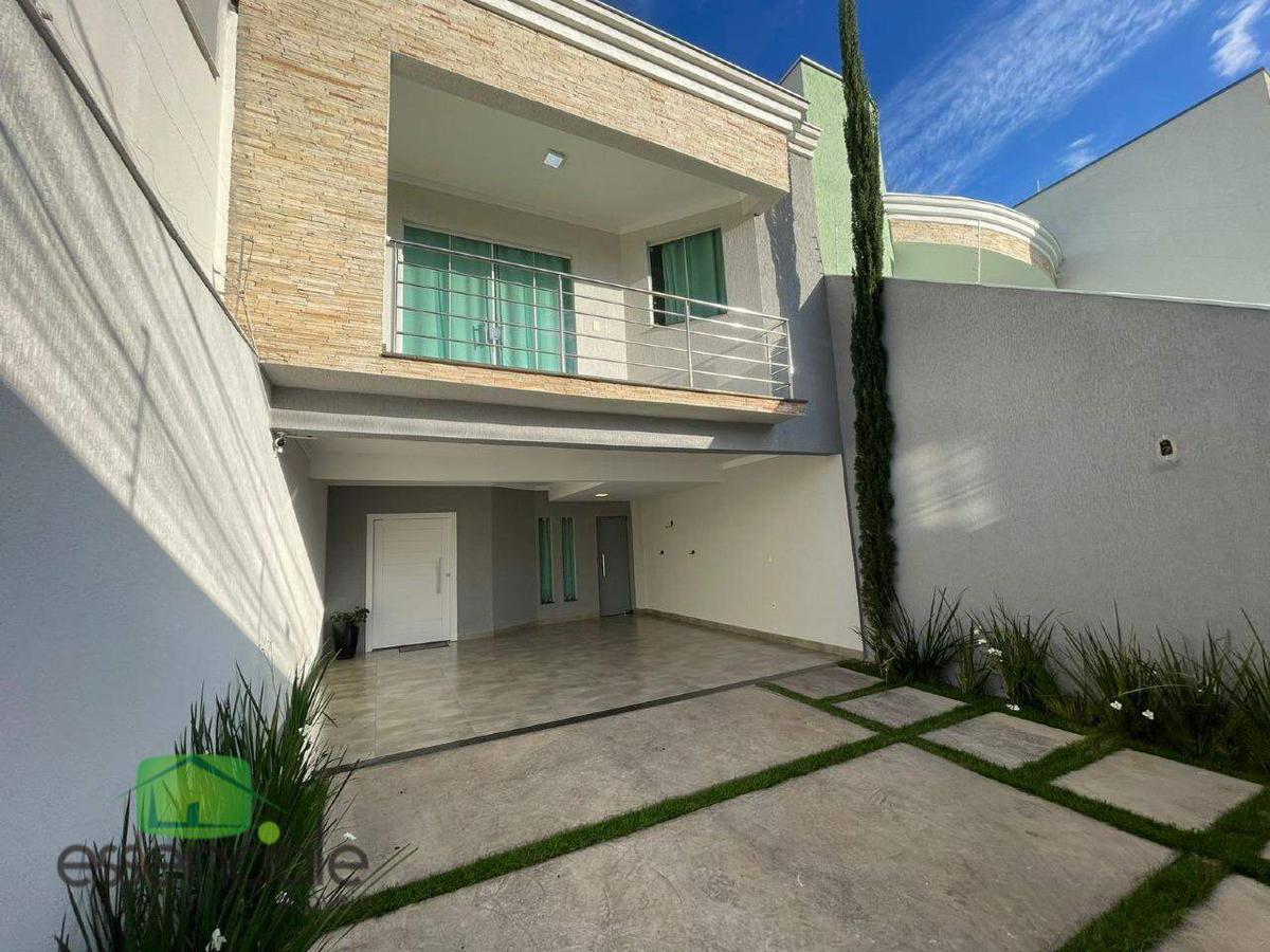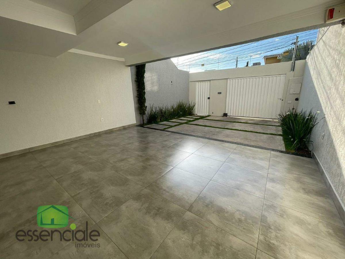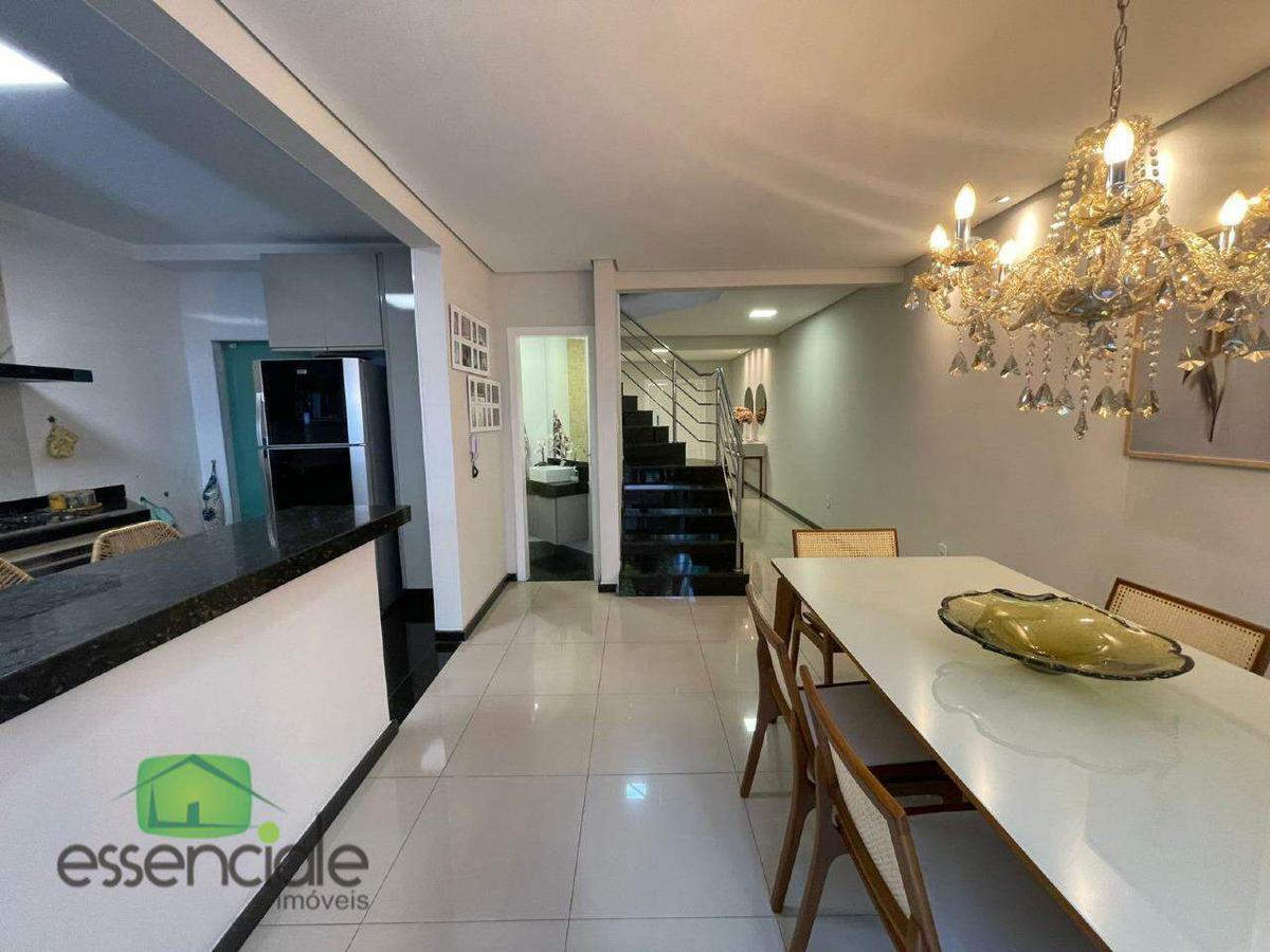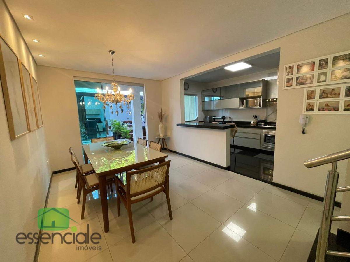 A casa possui três quartos, sendo uma suíte master com closet, varanda e ar-condicionado. Todos os quartos contam com armários planejados, cabeceiras e bancadas. A sala de estar é ampla, com cristaleira embutida e integrada à sala de jantar, criando um ambiente moderno e acolhedor. A cozinha americana é totalmente planejada, com armários sob medida e bancadas em granito, oferecendo praticidade e estilo no dia a dia.