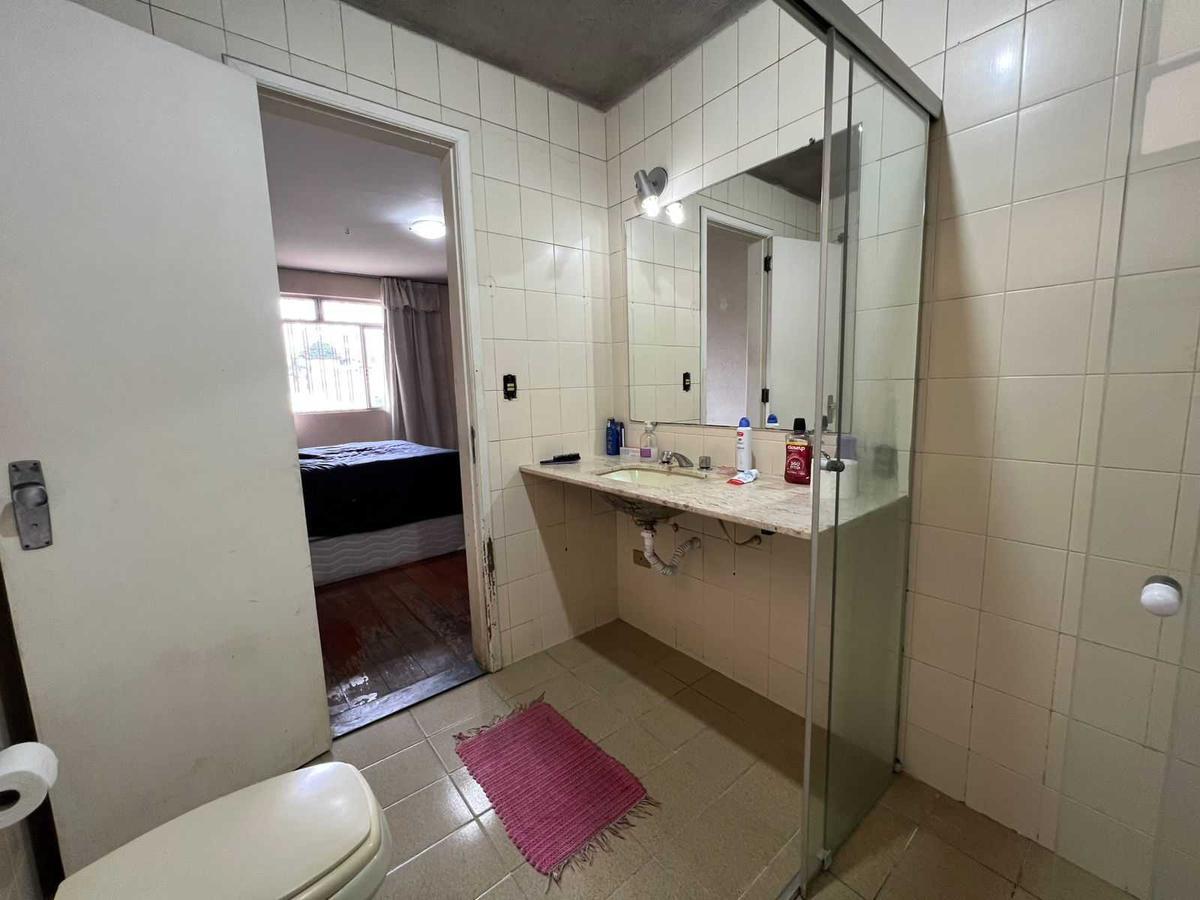 Banheiro social com espelho, bancada em mármore claro, box em vidro com estrutura em alumínio e piso em cerâmica