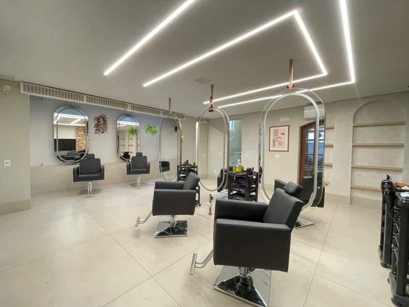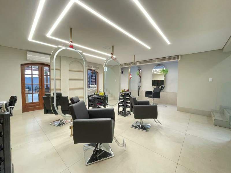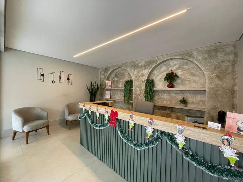 Sala ampla, bem iluminada, com piso em porcelanato