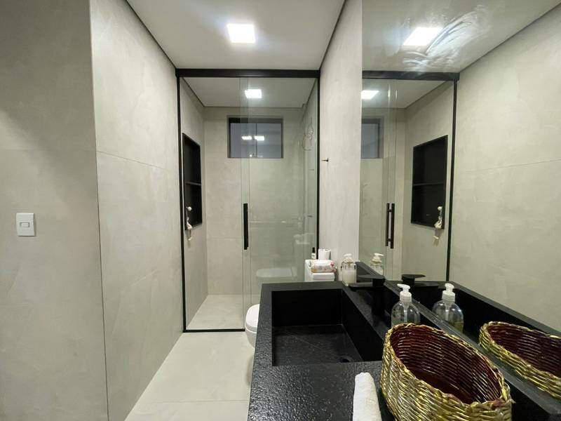 Suíte com piso em porcelanato bege claro, box com porta de vidro transparente e estrutura preta, além de bancada em pedra preta