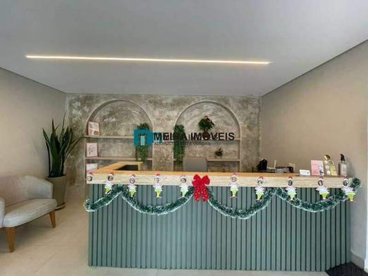 Sala ampla, bem iluminada, com piso em porcelanato