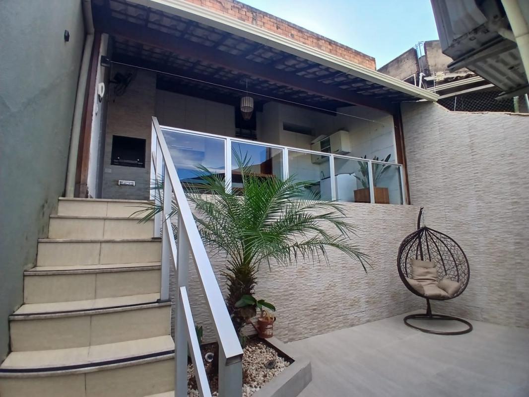 Área externa moderna com espaço gourmet, churrasqueira, banheiro e área de lavanderia. Casa toda reformada, clara e arejada.