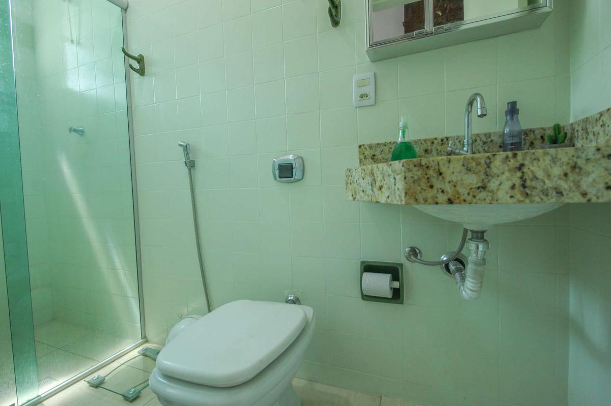 Banheiro social com acabamento em porcelanato e box em Blindex.