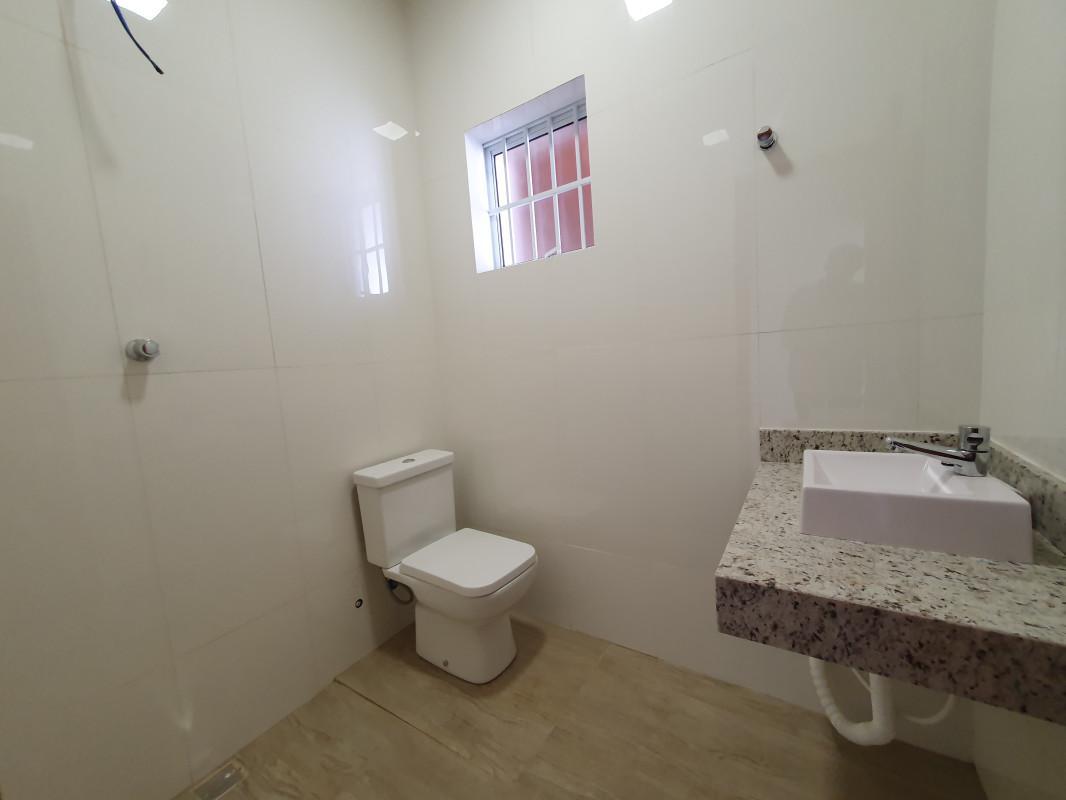 Banheiro com acabamento em porcelanato e bancada em granito